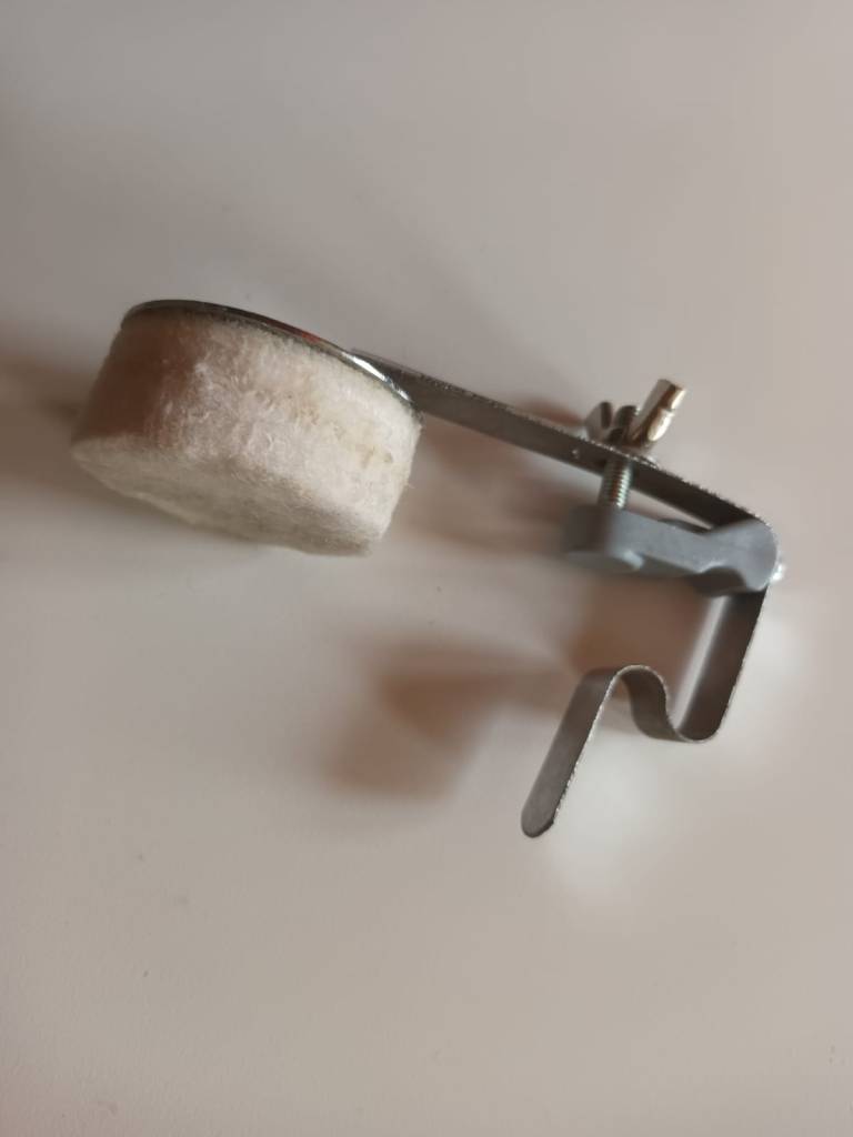 Tłumik zewnętrzny na obręcz, talerzyk jest wykonany z miękkiego filcu osadzonego na stalowej podstawie. Całość chromowana.