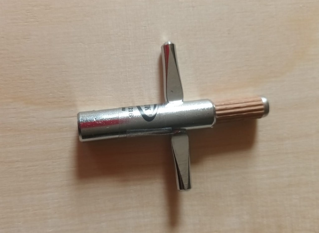 Kluczyk stalowy przystosowany do śrub o profilu główki w kwadracie 6 mm. Pokrętło drewniane ryflowane.