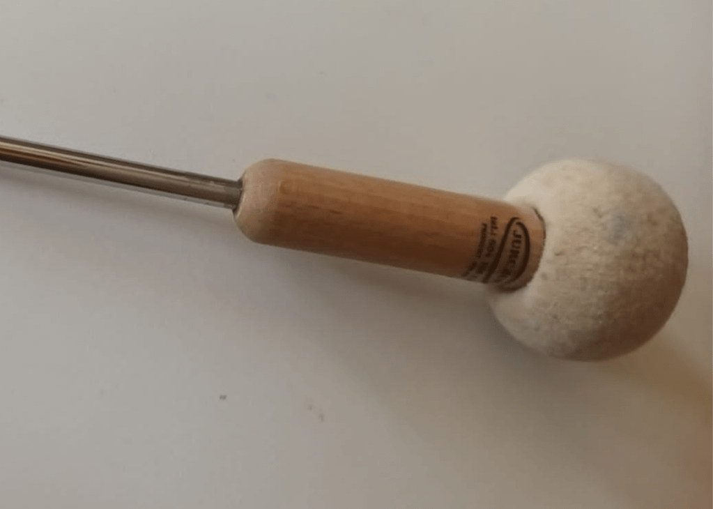 Wykonany z filcu twardego, główka jest osadzona na pręcie stalowym, wpuszczonym w wałek bukowy.