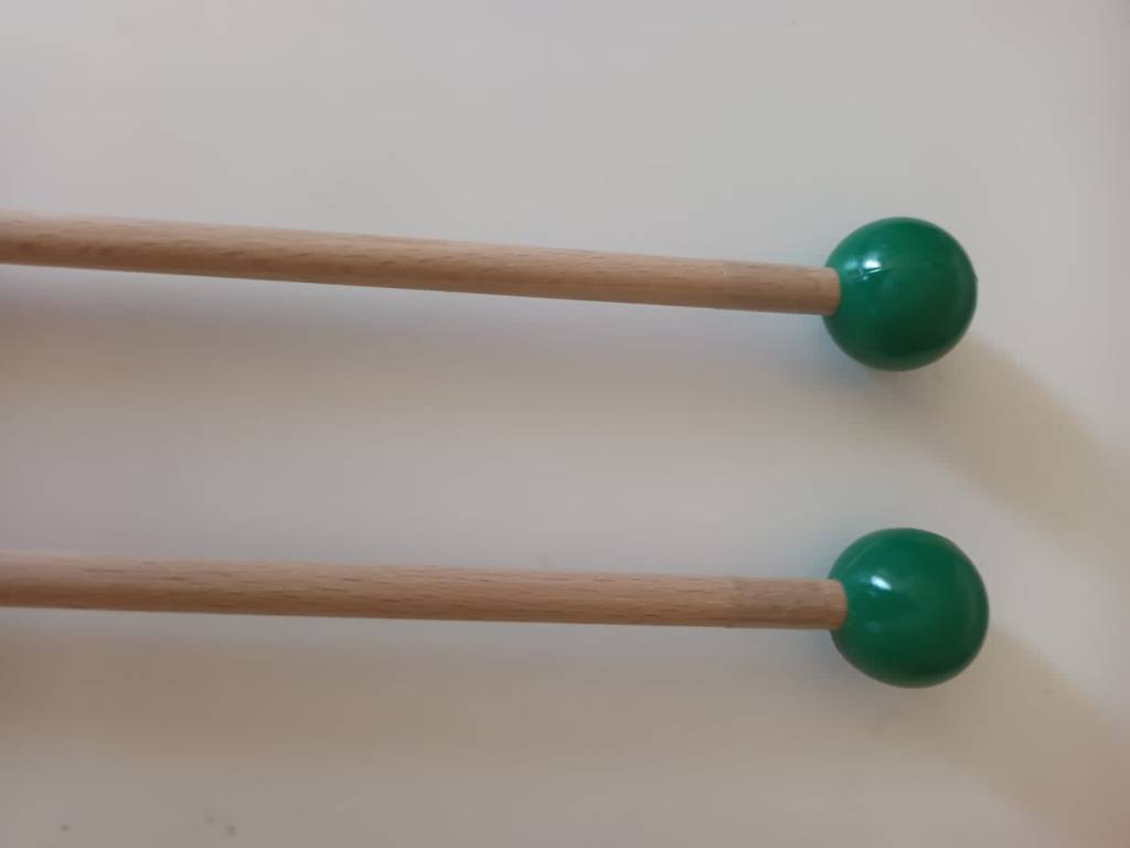 Półtwarda pałeczka do ksylofonu z zieloną gumową gałką o średnicy 26 mm. Trzonek drewniany o średnicy 8 mm, a całkowita długość 37 cm.
